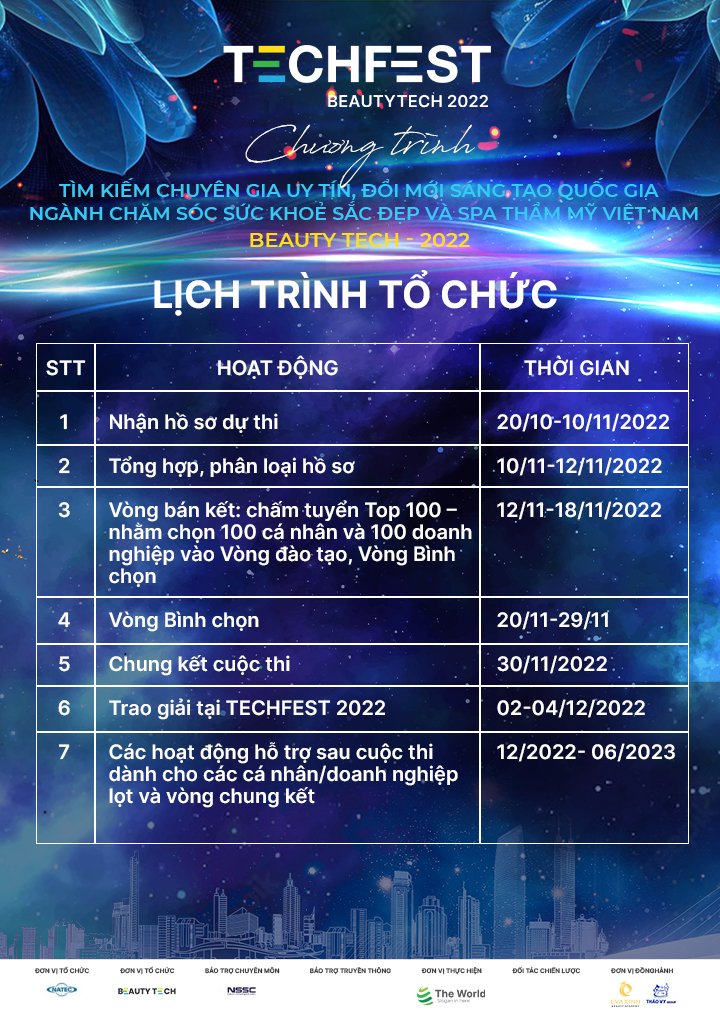 Cuộc thi “Tìm kiếm Chuyên gia, doanh nghiệp uy tín đổi mới sáng tạo quốc gia ngành chăm sóc sức khỏe sắc đẹp và spa thẩm mỹ Việt Nam” năm 2022 đã ở hồi kết. Với mong muốn tạo ra sân chơi quy mô, chuyên nghiệp để những bạn trẻ đam mê ngành chăm sóc sắc đẹp có cơ hội giao lưu học hỏi với đồng nghiệp, đồng thời khẳng định tay nghề, tài năng, bản lĩnh, BEAUTY TECH 2022 hứa hẹn sẽ thu hút hàng ngàn thí sinh và những người quan tâm đến ngành làm đẹp.
